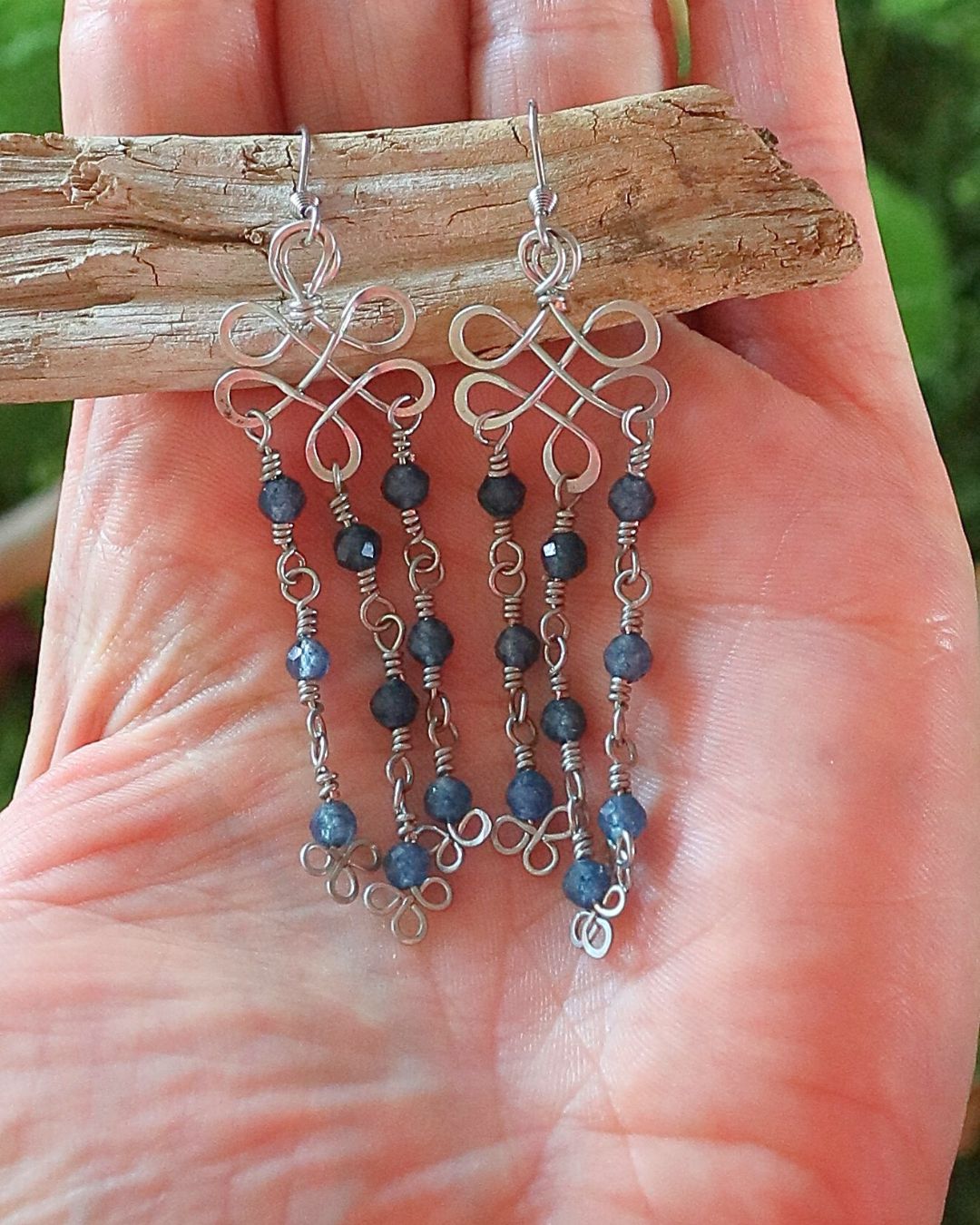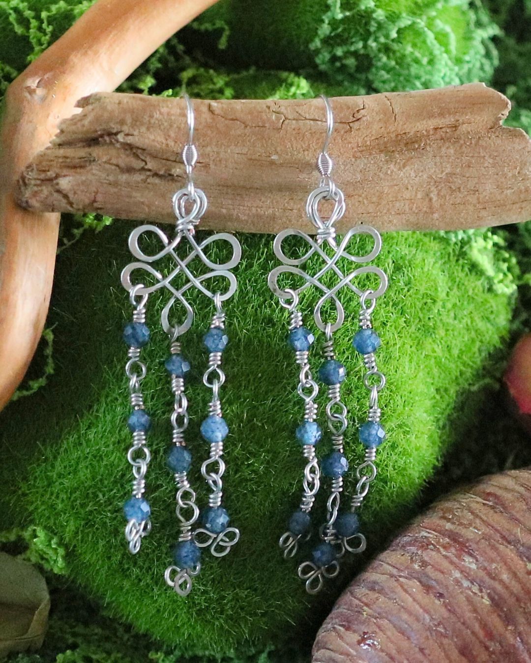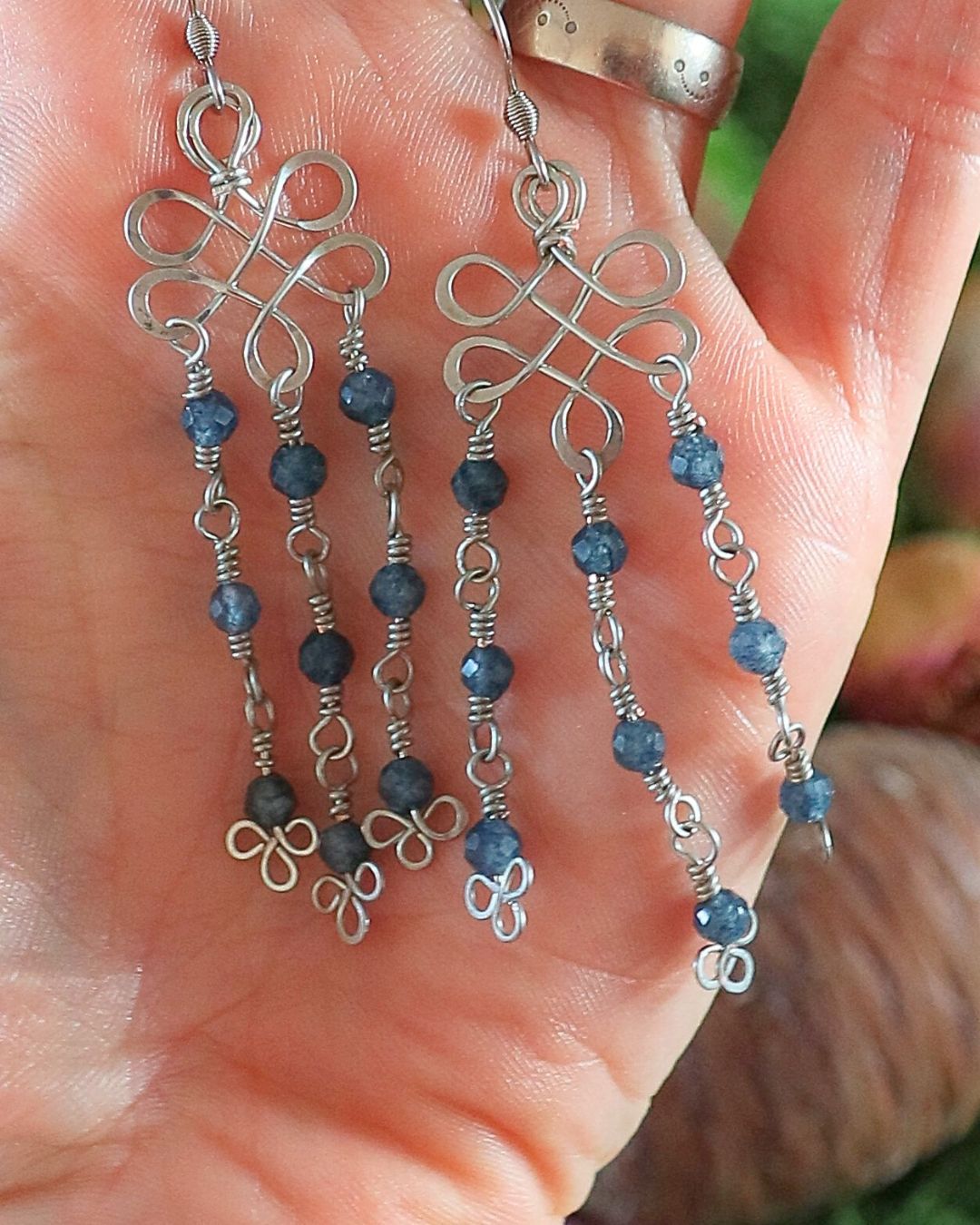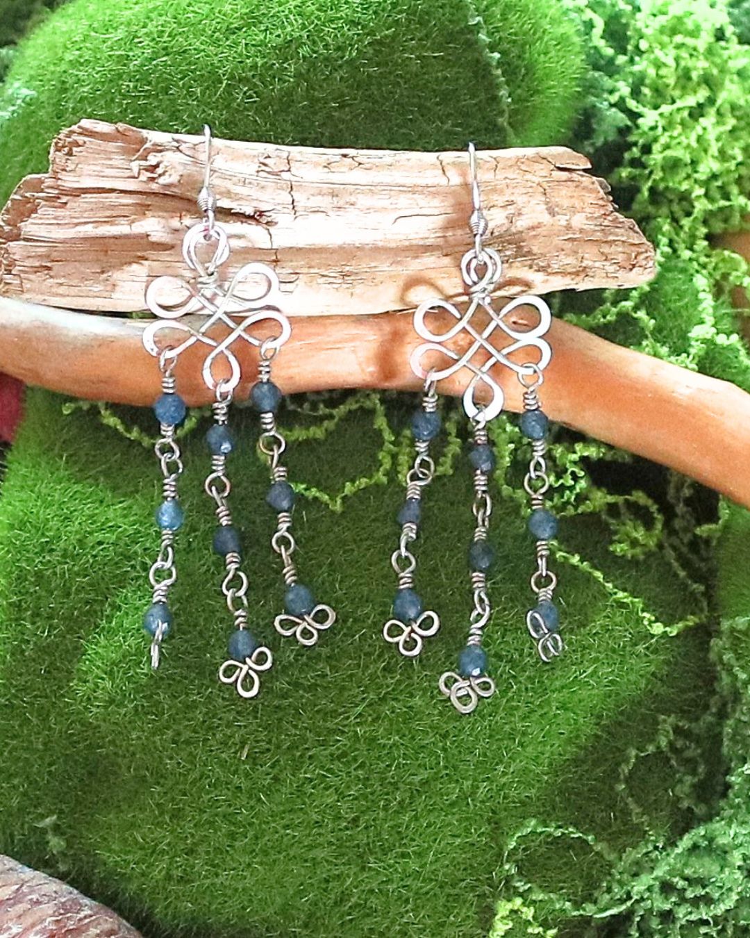 Boucles d’oreilles artisanales en cuivre plaqué argent, façonnées en entrelacs façon nœud celte et embellies de saphirs bruts facettés. Une création légère, symbolique et lumineuse.
