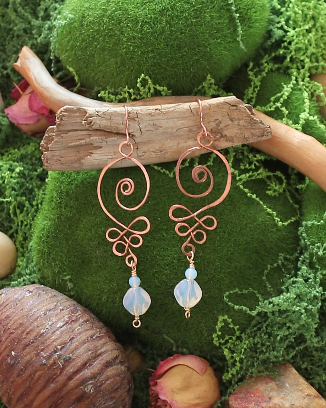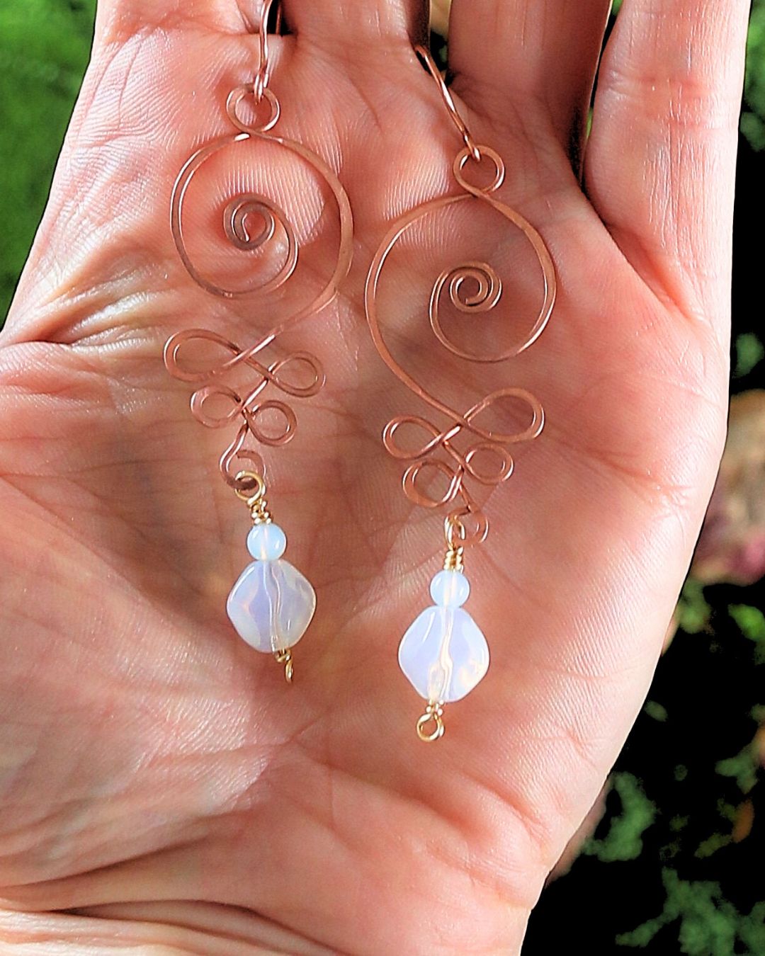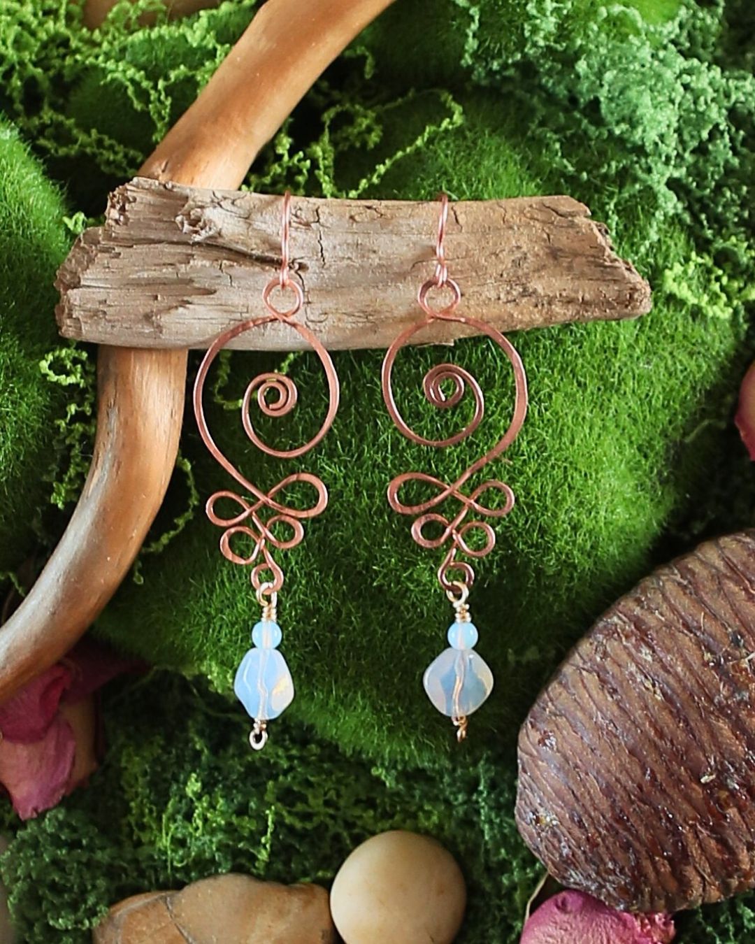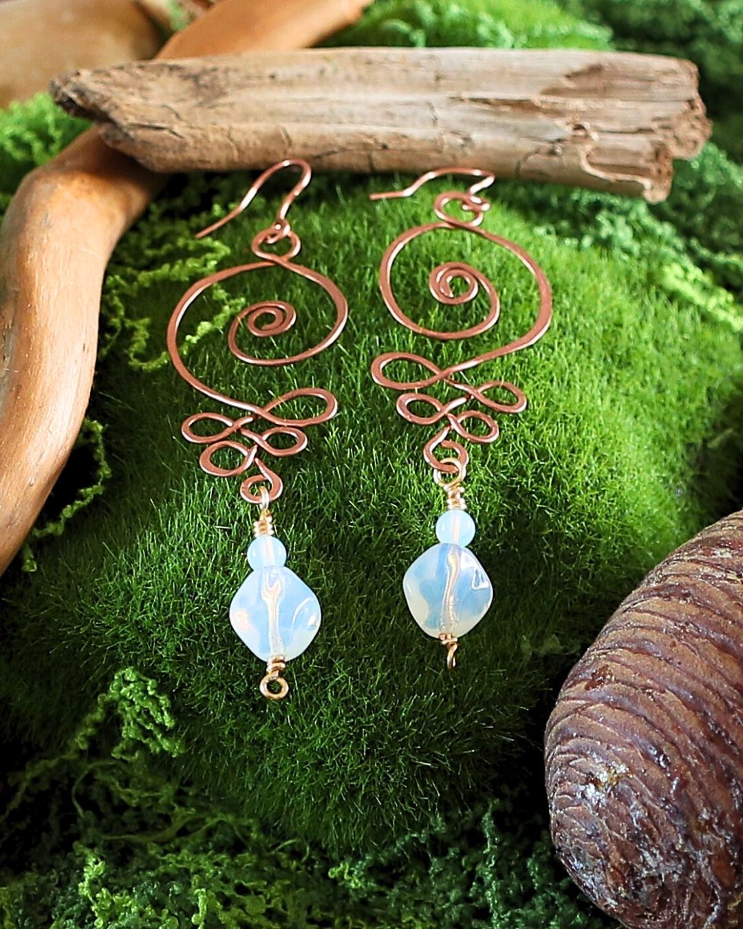 Boucles d’oreilles faites main en cuivre, ornées d’opale et d’opalite.