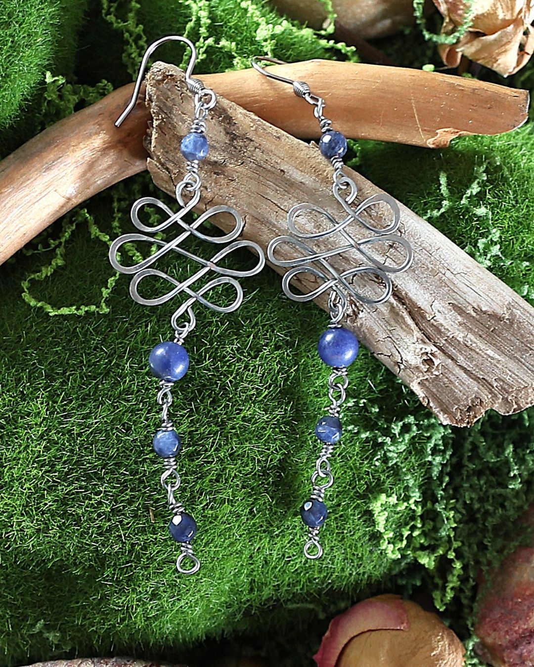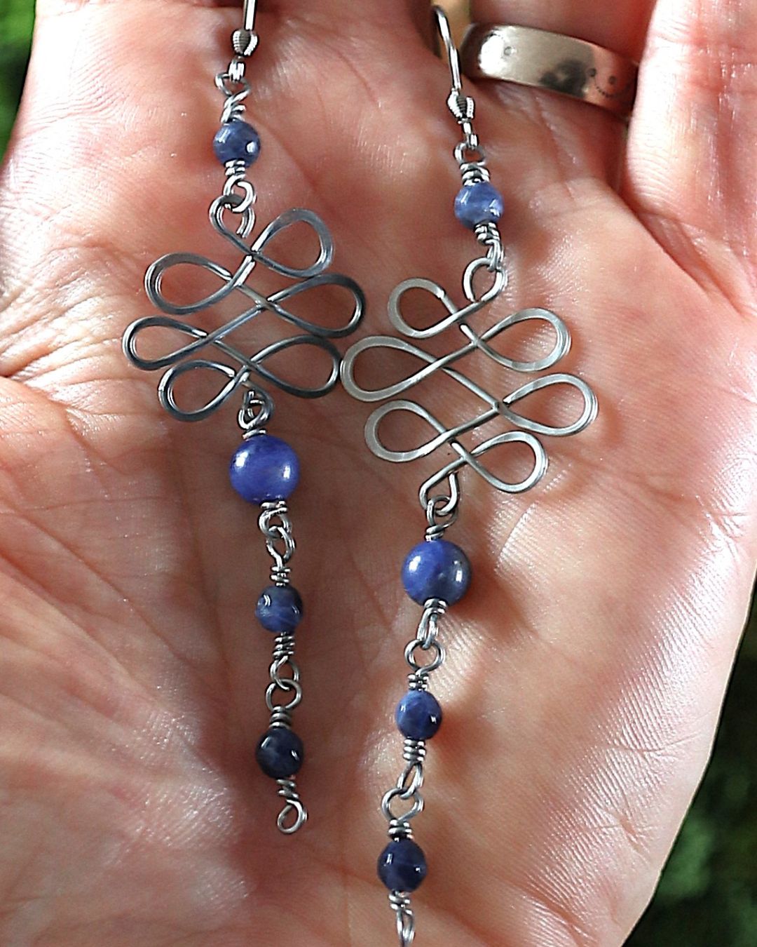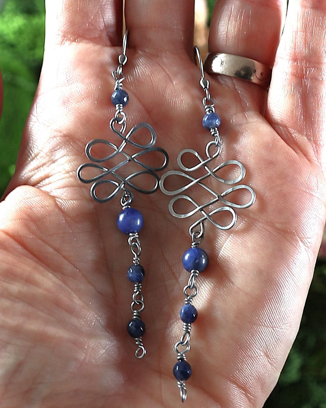 Ces boucles d’oreilles racontent le parcours intérieur de l’âme. Entièrement façonnées à la main, elles mêlent la finesse du wire-wrapping à la présence apaisante de la sodalite. Le dessin de l’unalome invite à suivre les méandres du chemin avant d’atteindre la clarté.