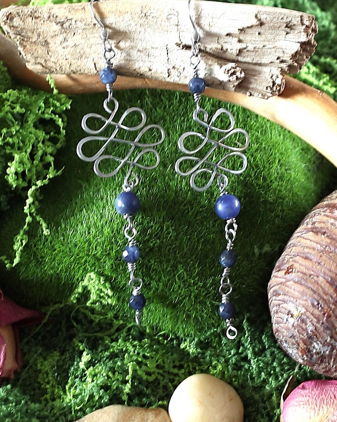 Boucles d’oreilles artisanales en sodalite et fil de laiton argenté, réalisées à la main selon la technique du wire-wrapping. L’unalome symbolise le chemin de l’éveil et la clarté intérieure.