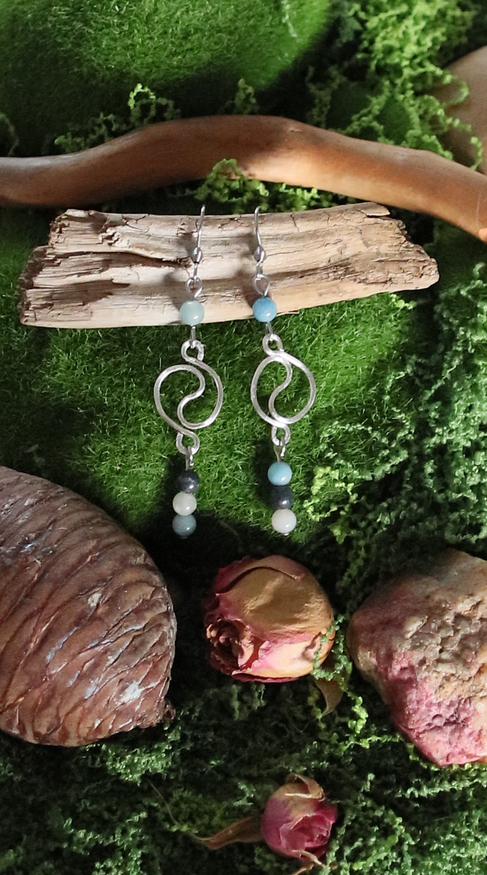 Chaque boucle est réalisée en wire-wrapping de cuivre plaqué argent. Le métal est modelé à la main pour former un motif yin-yang arrondi, souple, presque organique. Avec ce mouvement de métal, trois perles de trolleite naturelle prolongent la ligne. Leur palette calmante — du blanc laiteux au bleu profond — donne à la paire un équilibre subtil. Les perles ne sont jamais identiques, ce qui rend chaque boucle unique.