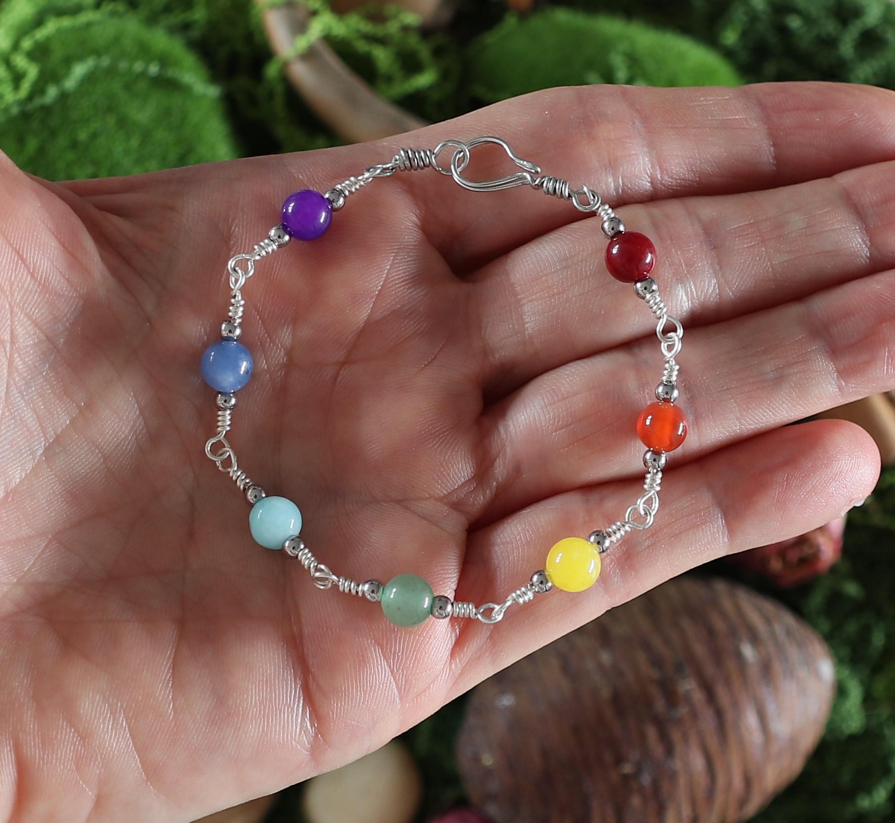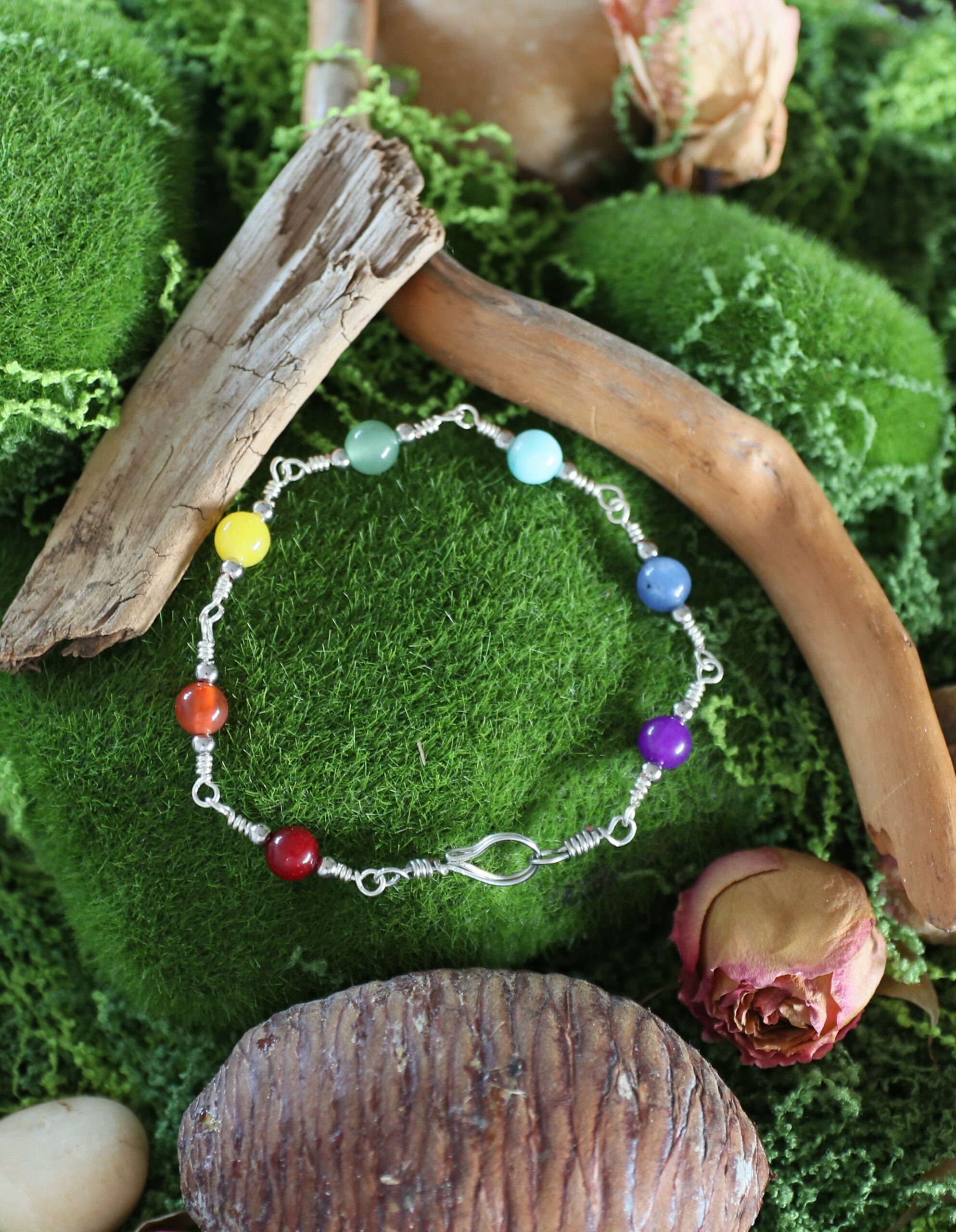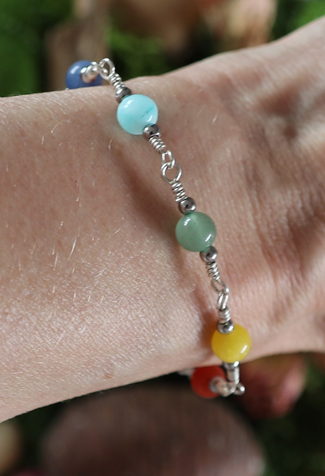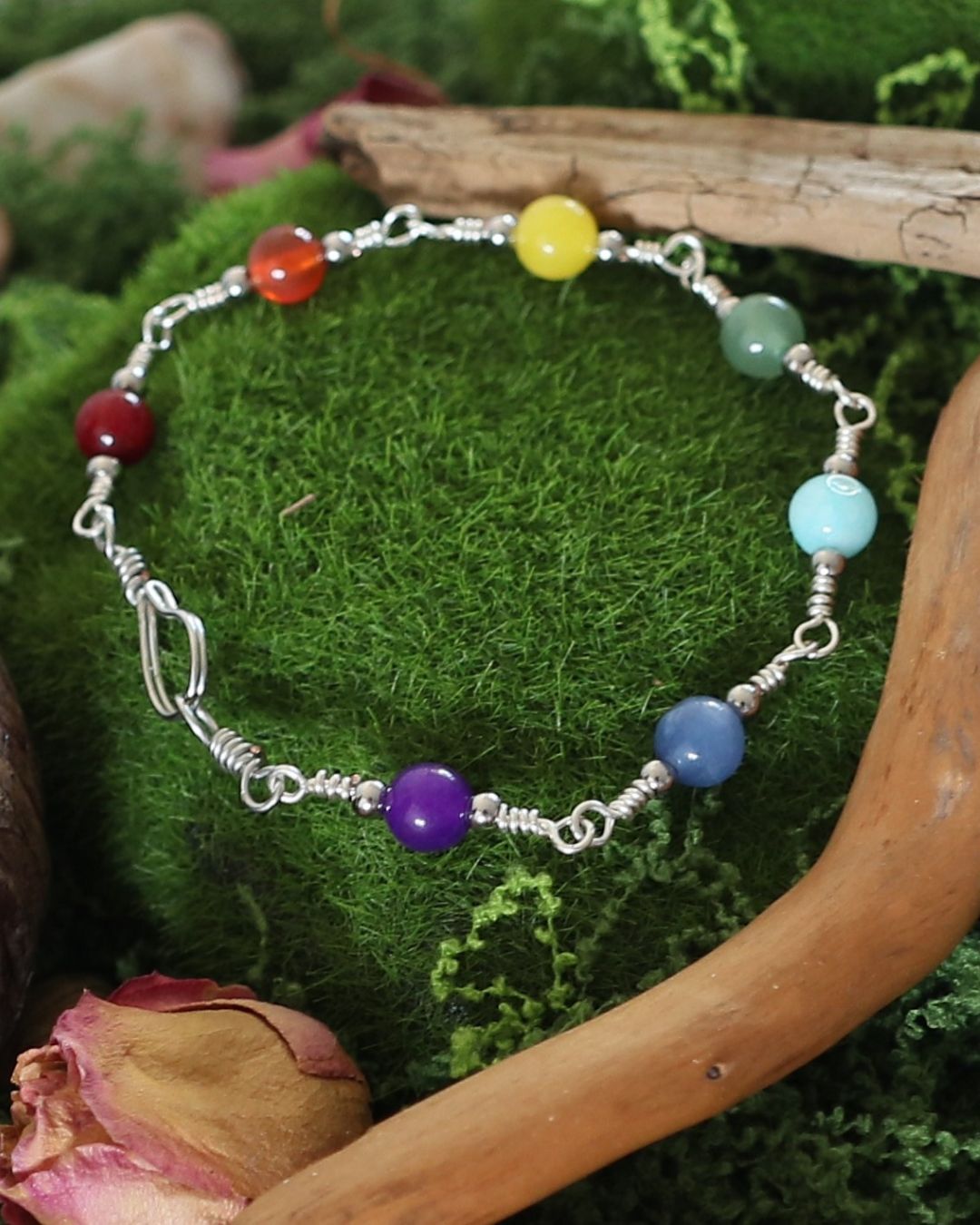 Bracelet des 7 chakras en pierres naturelles, réalisé à la main avec la technique du wire-wrapping. Un bijou d’équilibre et de lumière, symbole d’harmonie intérieure.