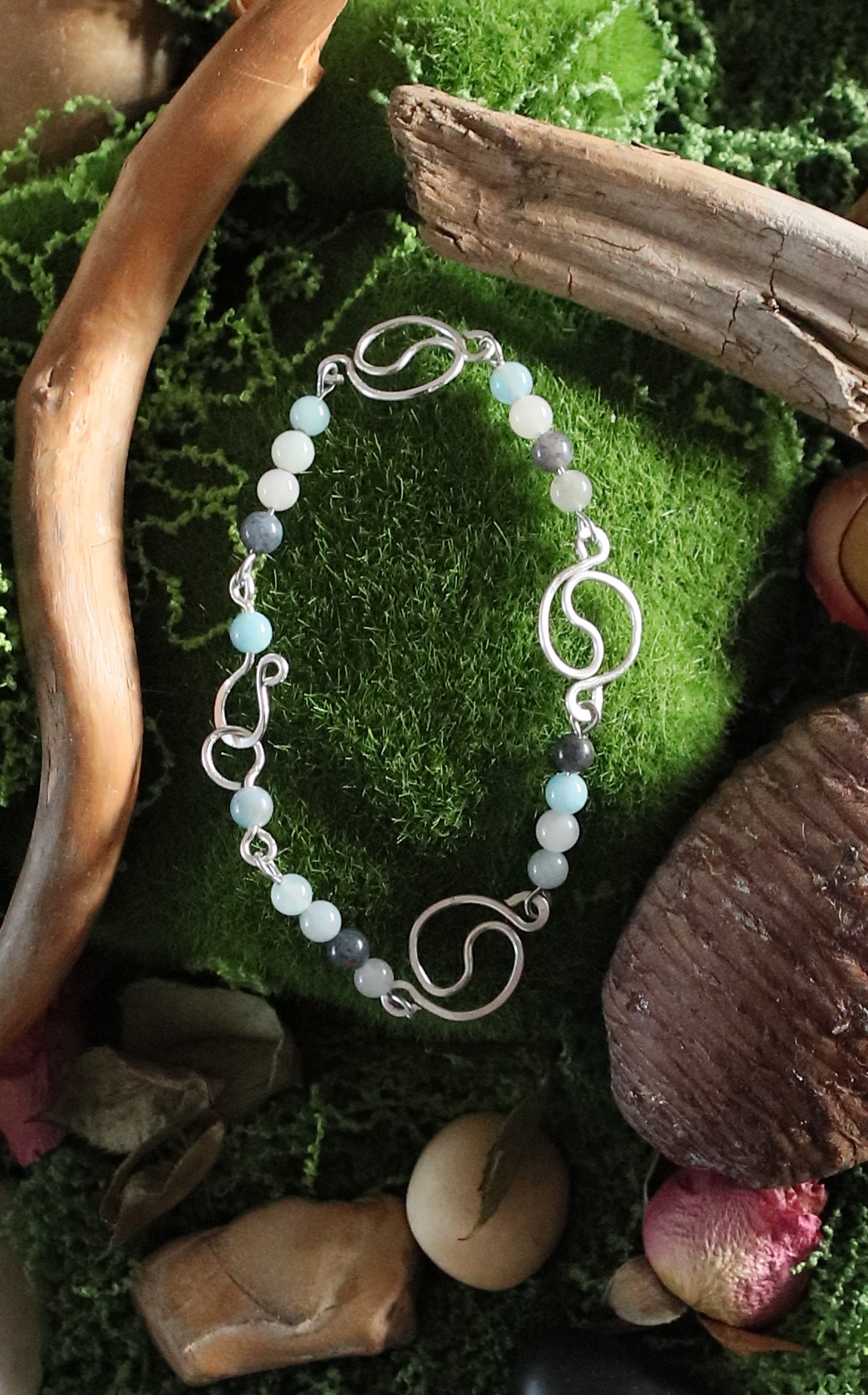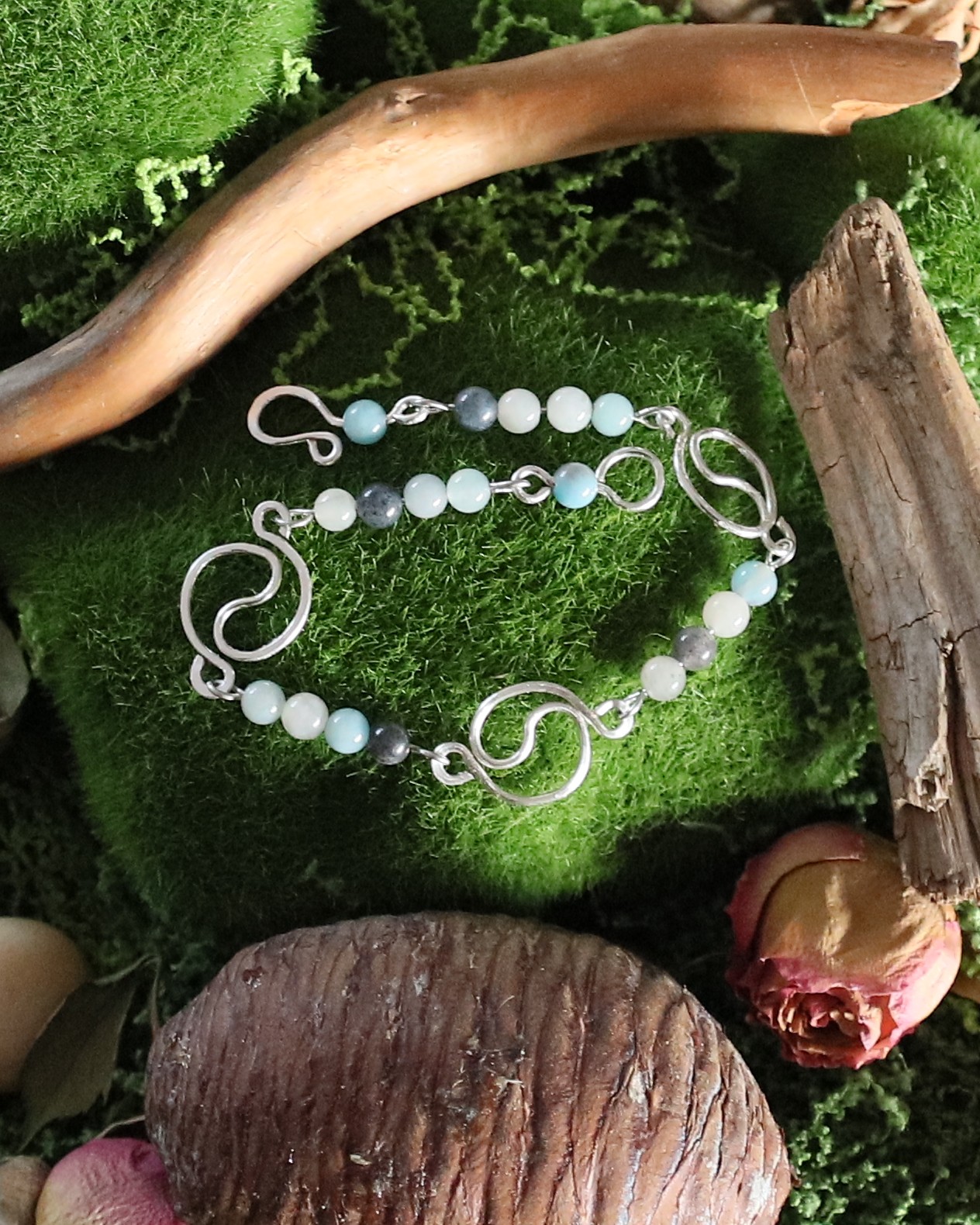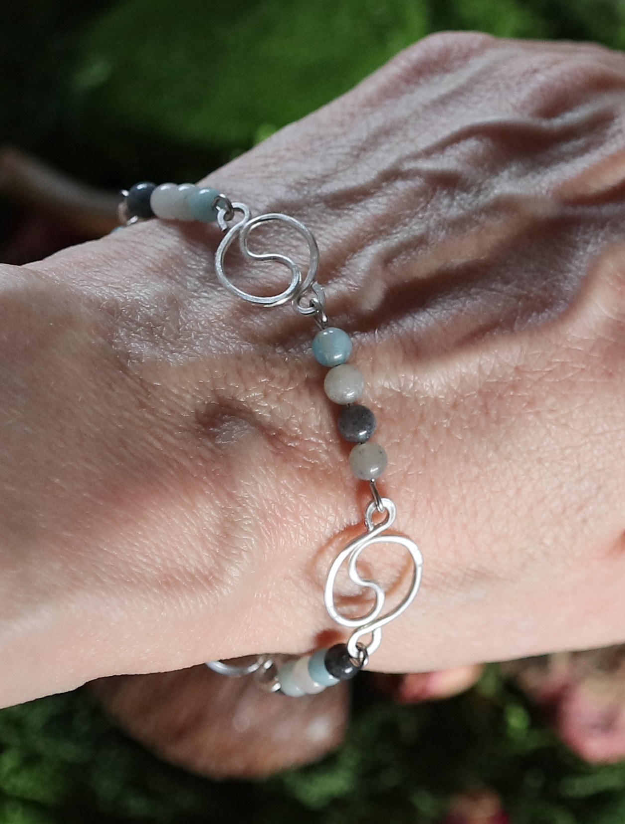 Le bracelet est façonné en wire-wrapping de cuivre plaqué argent. Le métal est plié à la main, patiemment, jusqu’à former deux connecteurs en forme de yin-yang. Les perles en trolleite naturelle apportent leur palette apaisante. Certaines sont blanc laiteux, d’autres gris profond, d’autres encore bleu nuit. Cette variation crée un rythme visuel très doux, comme une respiration. Chaque perle est sélectionnée pour son aspect, son toucher et sa vibration.