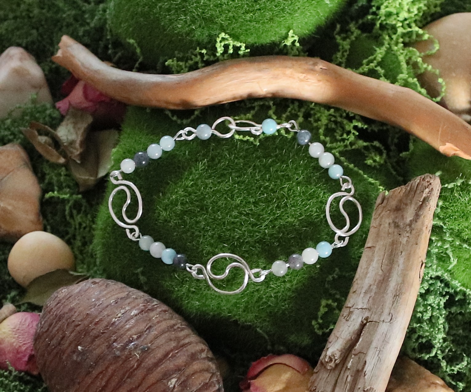 Bracelet artisanal en wire-wrapping de cuivre plaqué argent, orné de perles de trolleite naturelle aux couleurs douces, du blanc laiteux au bleu nuit. Un bijou pensé comme un cercle d’équilibre, façonné autour de connecteurs yin-yang. Une pièce unique, légère et apaisante.