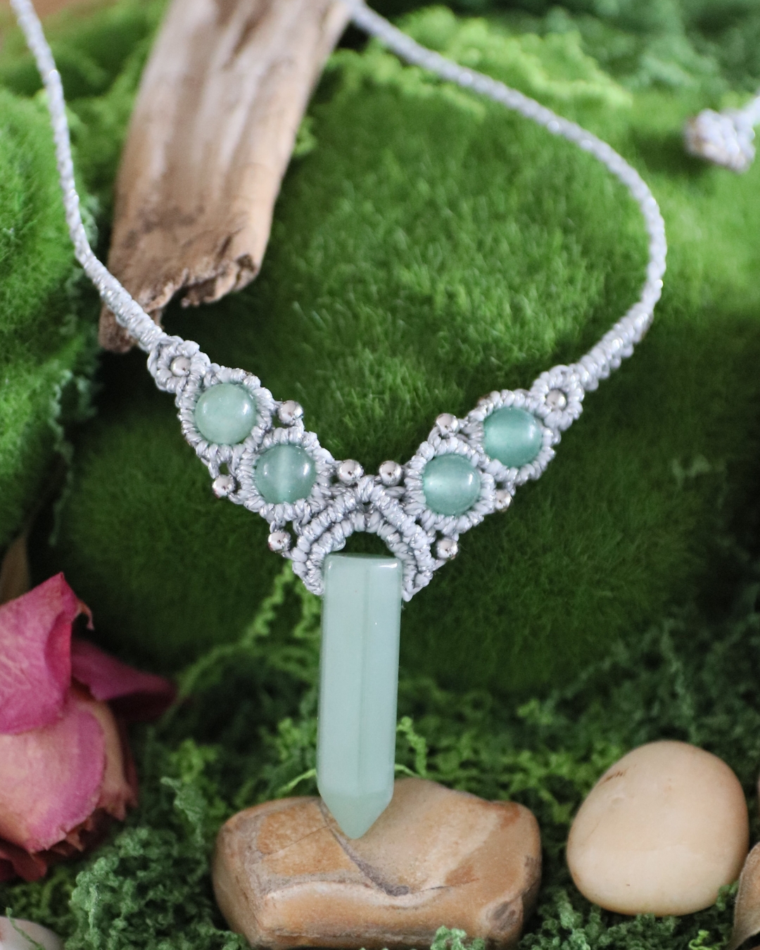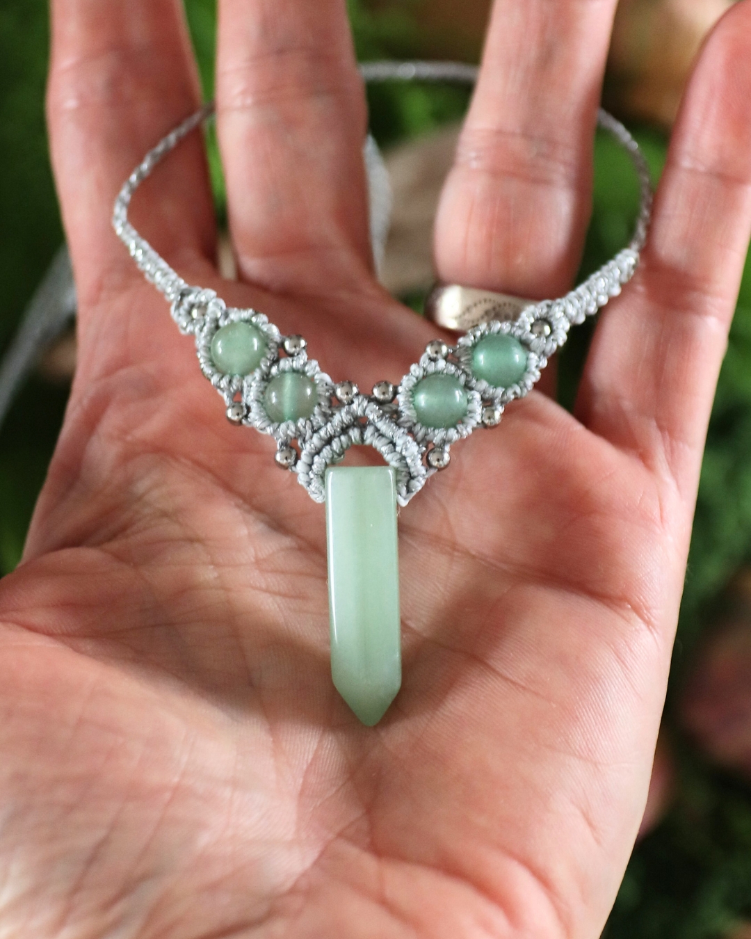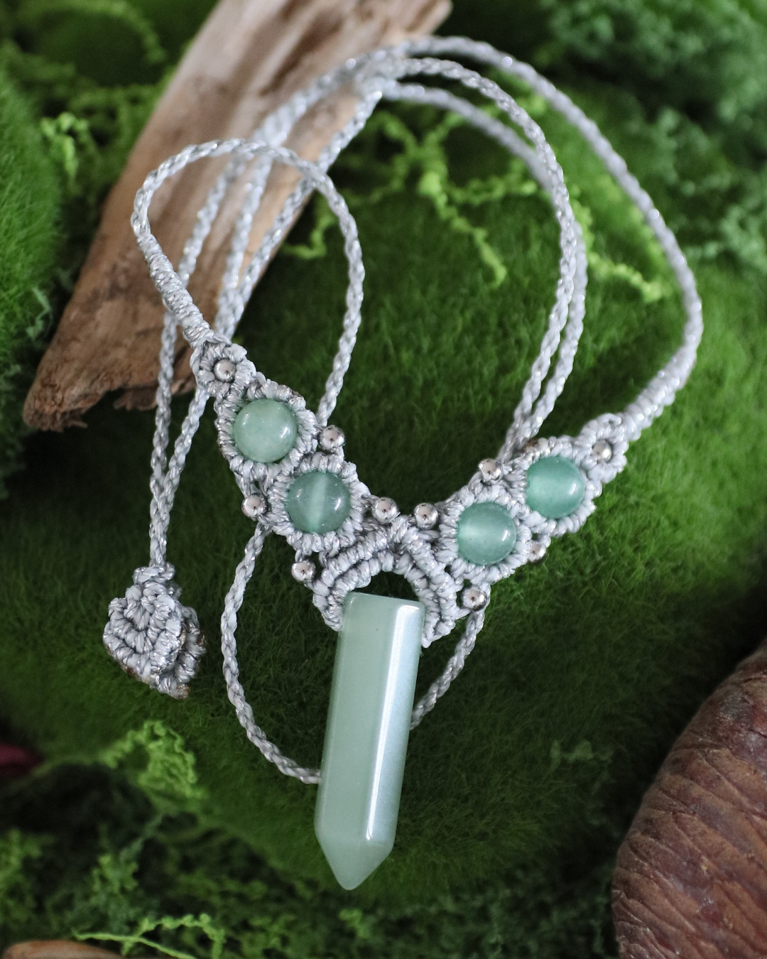 Collier ajustable en micro-macramé argenté, orné d’une pointe prisme en aventurine verte et de perles d’acier inoxydable. Un bijou artisanal qui favorise équilibre et ouverture du cœur.