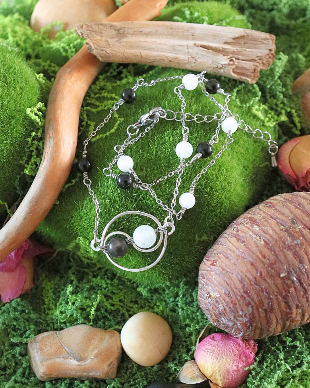 Le pendentif est construit en fil de cuivre argenté, travaillé à la main pour former ce symbole intemporel. Au centre, deux perles naturelles s’équilibrent : une pierre de lune lumineuse et une obsidienne de glace profonde.