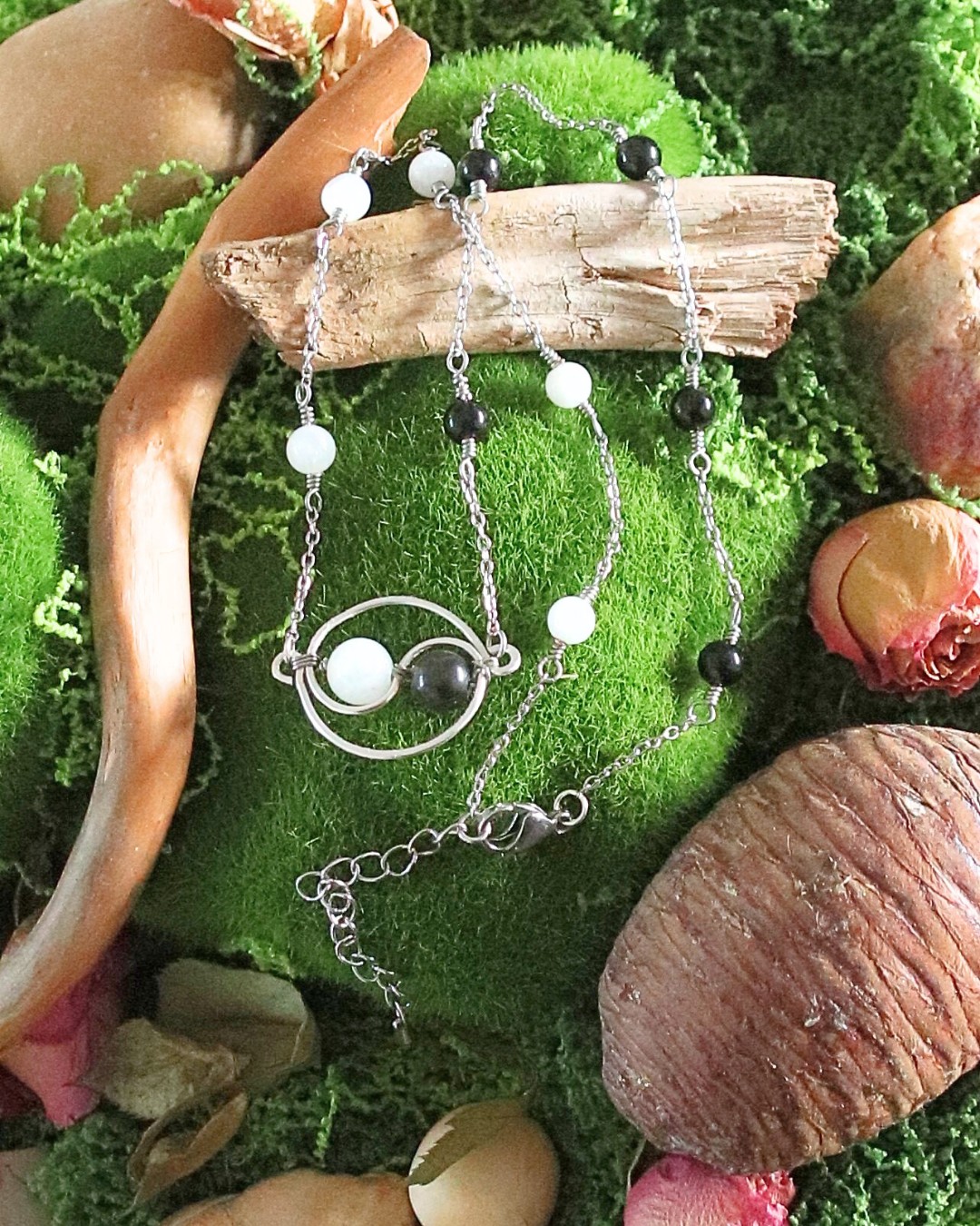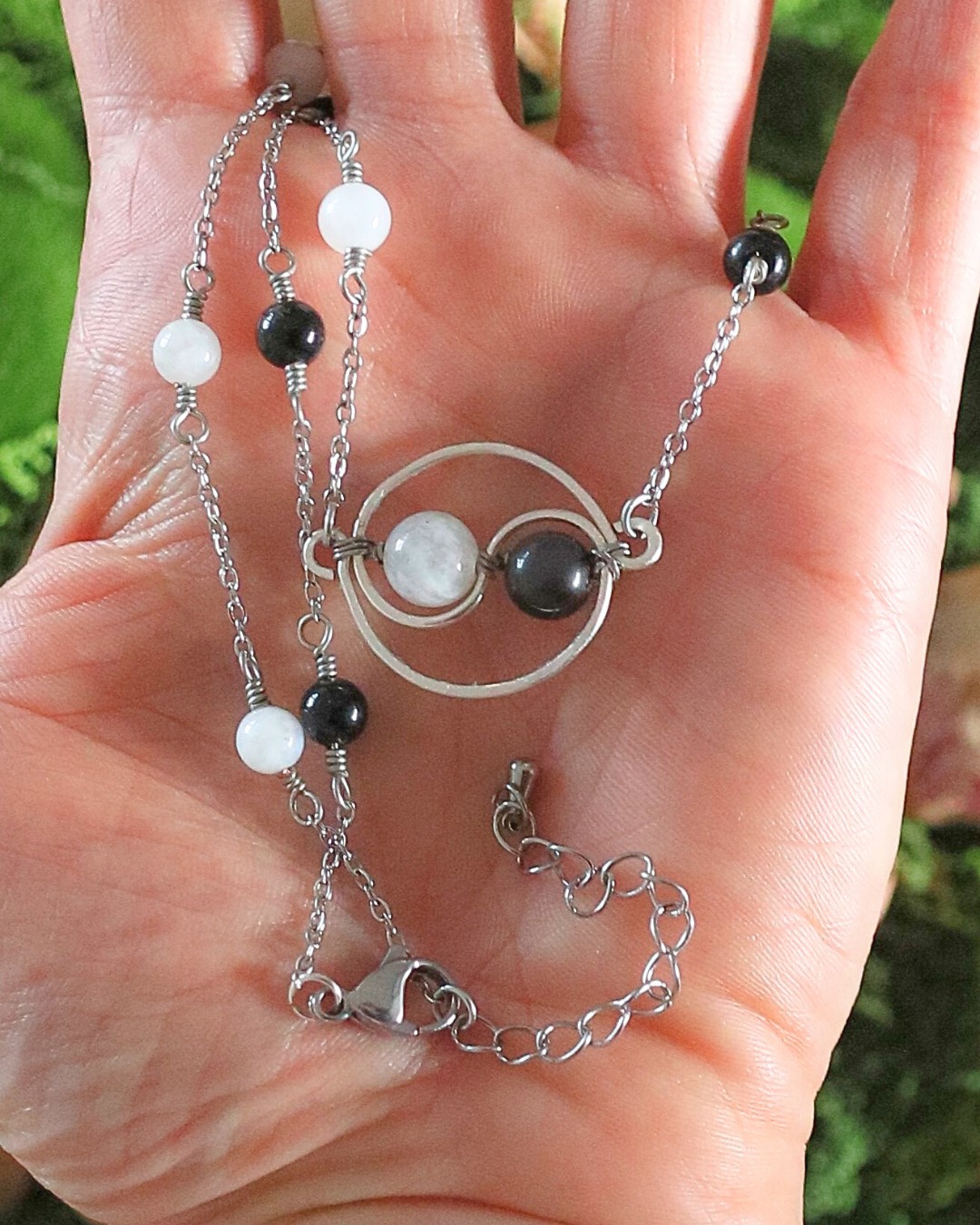 Collier artisanal en pierre de lune et obsidienne de glace, monté sur acier inoxydable. Pendentif yin yang façonné à la main en fil de cuivre plaqué argent. Un bijou équilibrant, doux et protecteur.