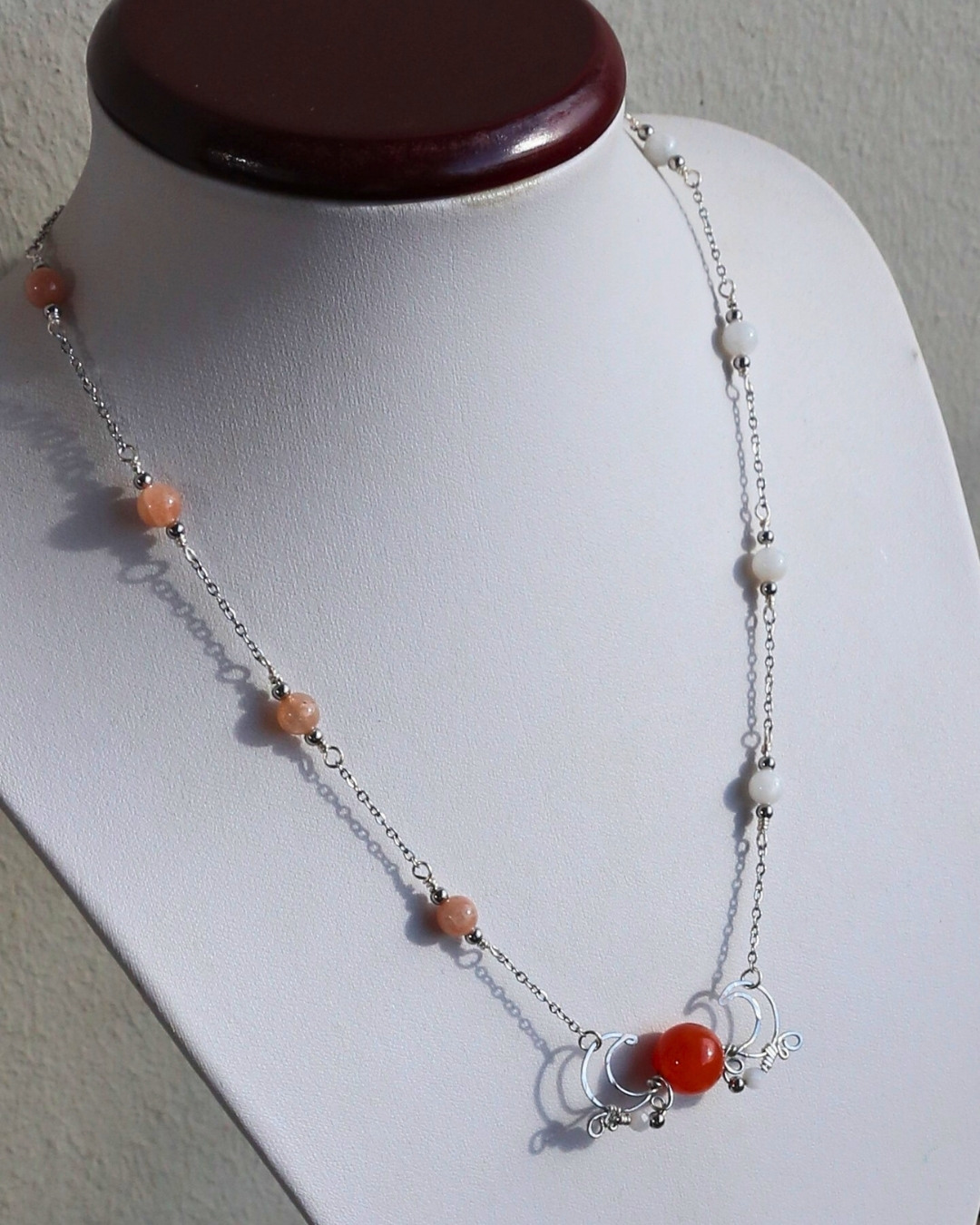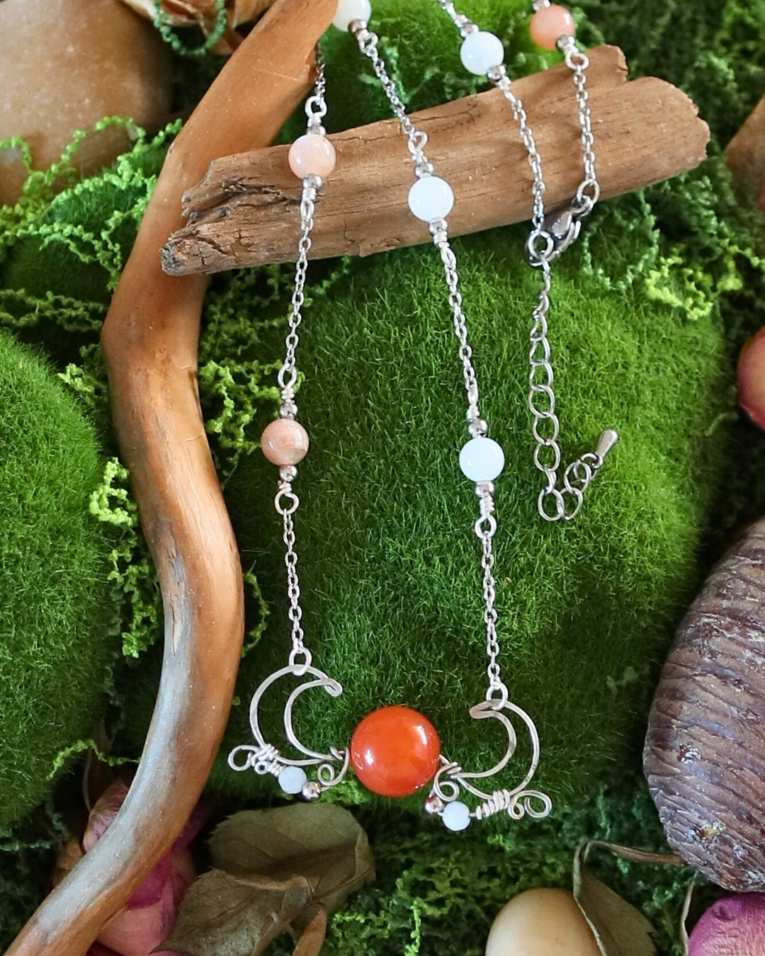 Collier soleil et lune fait main, associant cornaline, pierre de lune et de soleil et acier inoxydable. Une création symbolique, équilibrée et vibrante.